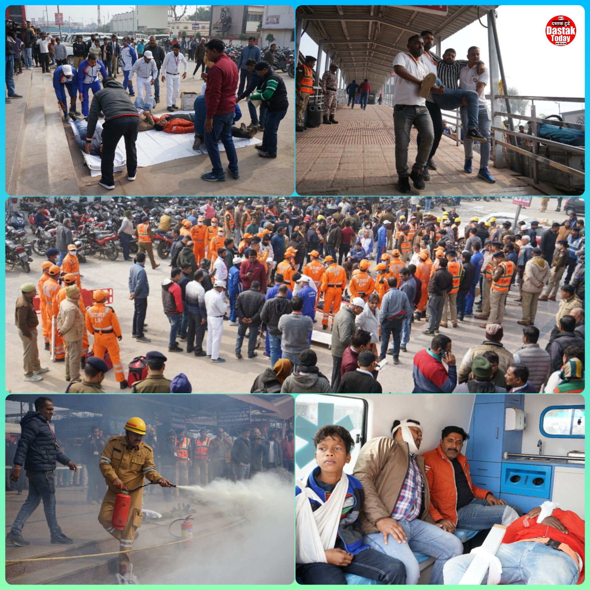 प्रथम चरण:यह प्रदर्शित किया गया कि एक ही समय में स्टेशन पर भारी संख्या में लोग आ गए हैं, जिसके कारण प्लेटफार्म संख्या एक पर स्थापित फुट ओवर ब्रिज क्षतिग्रस्त हो गया है, जिसमें कई व्यक्ति घायल हो गए हैं। फुट ओवर ब्रिज क्षतिग्रस्त होने के कारण उसमें 15 लोग दबे हुए हैं, जिनको निकालने के लिए रेलवे की टेक्निकल टीम कटर मशीन आदि अन्य संसाधनों का प्रयोग कर फंसे हुए लोगों को सुरक्षित बाहर निकालने की कार्रवाई को प्रदर्शित करती है। सभी को सुरक्षित बाहर निकालने के पश्चात उन्हें प्राथमिक उपचार प्रदान कर जिला अस्पताल रेफर किया जाता है।